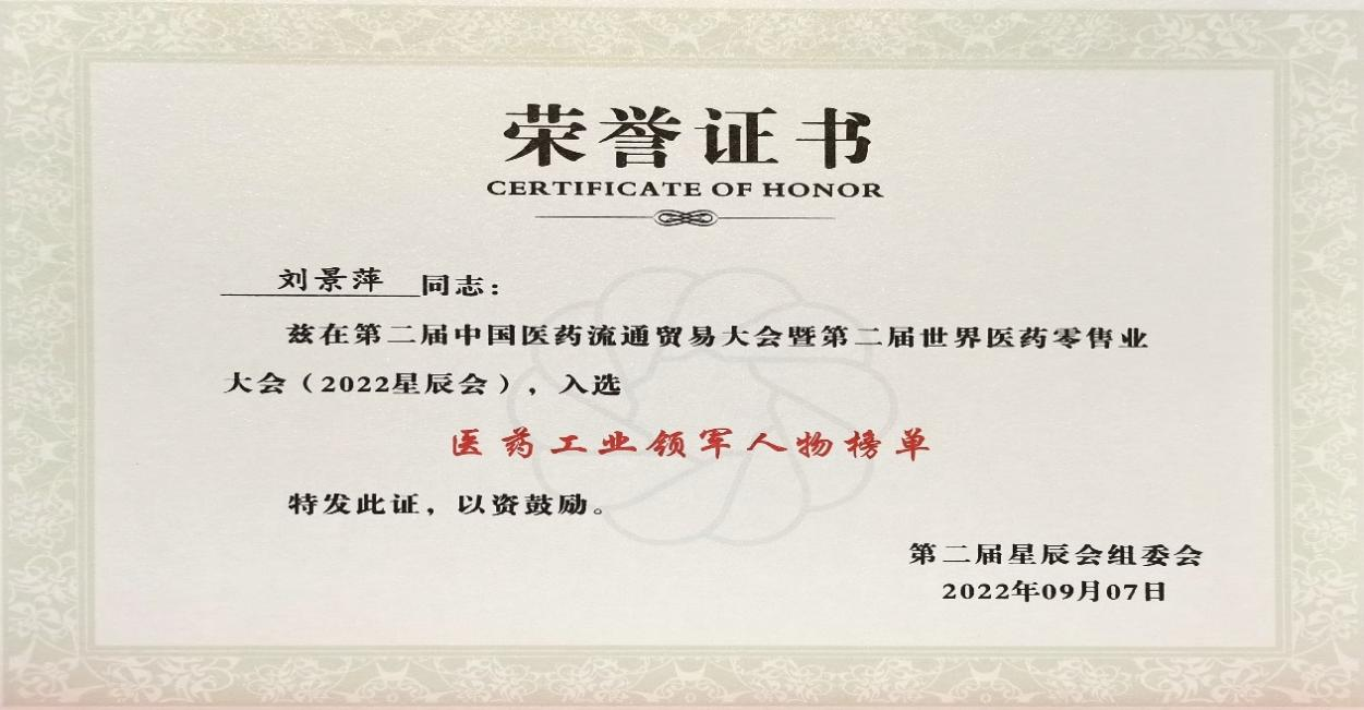 在本次开幕式上,发布了“医药工业领军人物”、“医药零售领军人物”榜单,抖圈药业集团刘景萍董事长凭借在儿药领域多年的努力探索和对行业的杰出贡献,荣获“医药工业领军人物”称号。